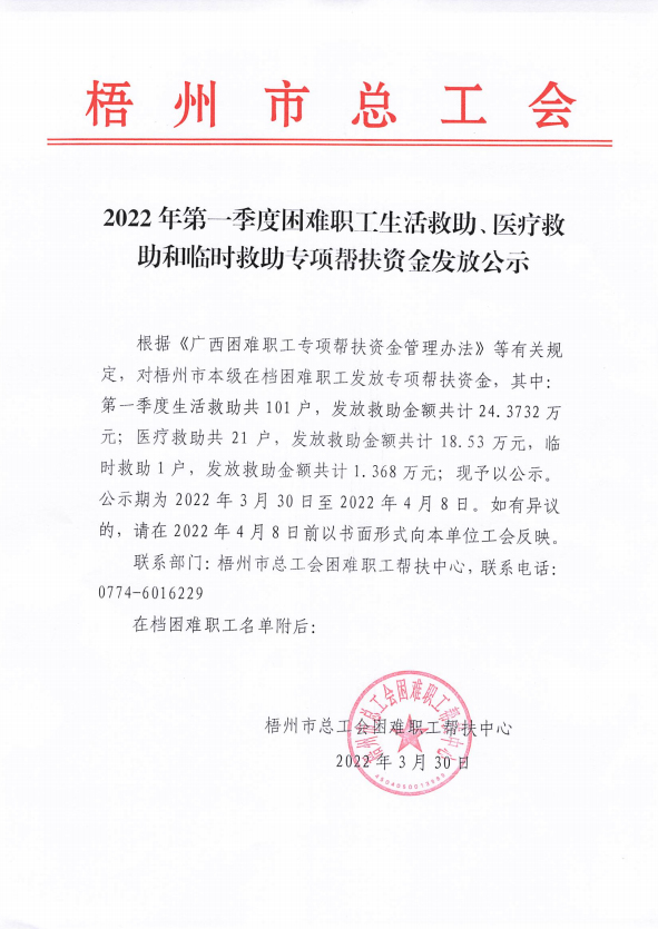 2022年第一季度困難職工生活救助、醫(yī)療救助和臨時救助專項幫扶資金發(fā)放公示