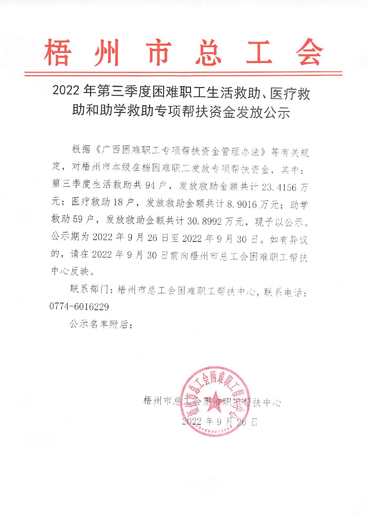 2022年第三季度困難職工生活救助、醫(yī)療救助和助學(xué)救助專項(xiàng)幫扶資金發(fā)放公示