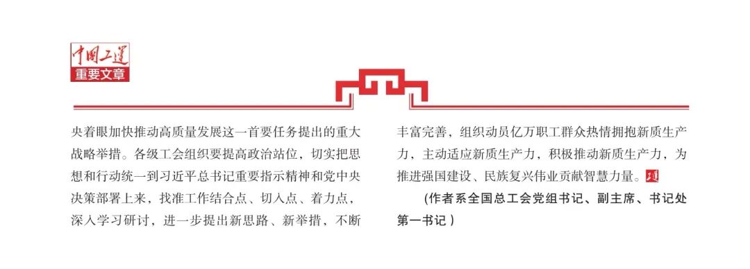 發(fā)展新質(zhì)生產(chǎn)力,是以習(xí)近平同志為核心的黨中央著眼加快推動(dòng)高質(zhì)量發(fā)展這一首要任務(wù)提出的重大戰(zhàn)略舉措。各級(jí)工會(huì)組織要提高政治站位,切實(shí)把思想和行動(dòng)統(tǒng)一到習(xí)近平總書記重要指示精神和黨中央決策部署上來(lái),找準(zhǔn)工作結(jié)合點(diǎn)、切入點(diǎn)、著力點(diǎn),深入學(xué)習(xí)研討,進(jìn)一步提出新思路、新舉措,不斷豐富完善,組織動(dòng)員億萬(wàn)職工群眾熱情擁抱新質(zhì)生產(chǎn)力,主動(dòng)適應(yīng)新質(zhì)生產(chǎn)力,積極推動(dòng)新質(zhì)生產(chǎn)力,為推進(jìn)強(qiáng)國(guó)建設(shè)、民族復(fù)興偉業(yè)貢獻(xiàn)智慧力量。